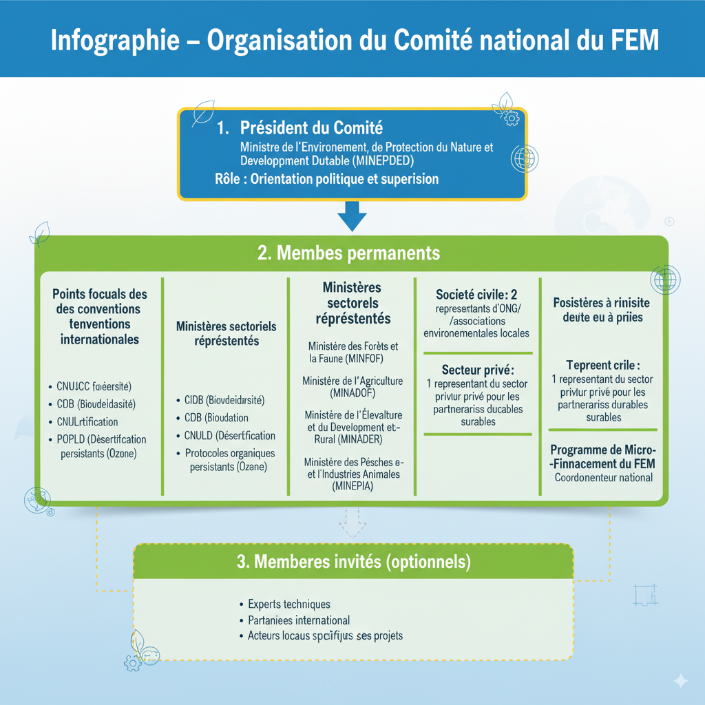 La composition du comité inclut les points focaux des conventions internationales ratifiées par le Cameroun (CCNUCC, CDB, CNULD, POPs, Ozone), des représentants de plusieurs ministères sectoriels (Forêts, Agriculture, Élevage), deux représentants de la société civile, un représentant du secteur privé, et le coordonnateur national du programme de micro-financement du FEM. Le ministre peut également inviter d’autres personnes compétentes à participer aux réunions.